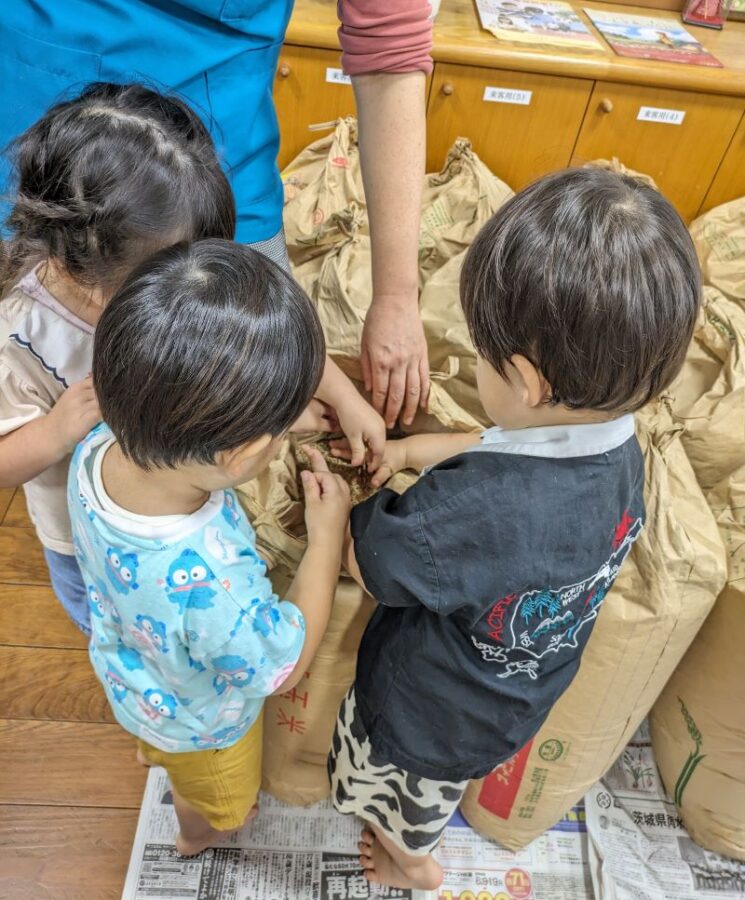 目の前に並んだたくさんのお米に、子どもたちはびっくり!もみがついたお米を手にいっぱい掴んで、その感触を楽しんでいました。あたたかいご支援ありがとうございました。