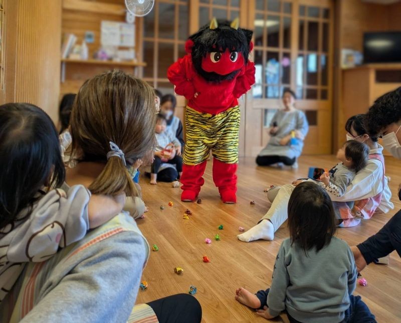 「おには〜そと〜」と元気な声で予行練習をしていると…どこからともなく赤鬼さんの登場です!
