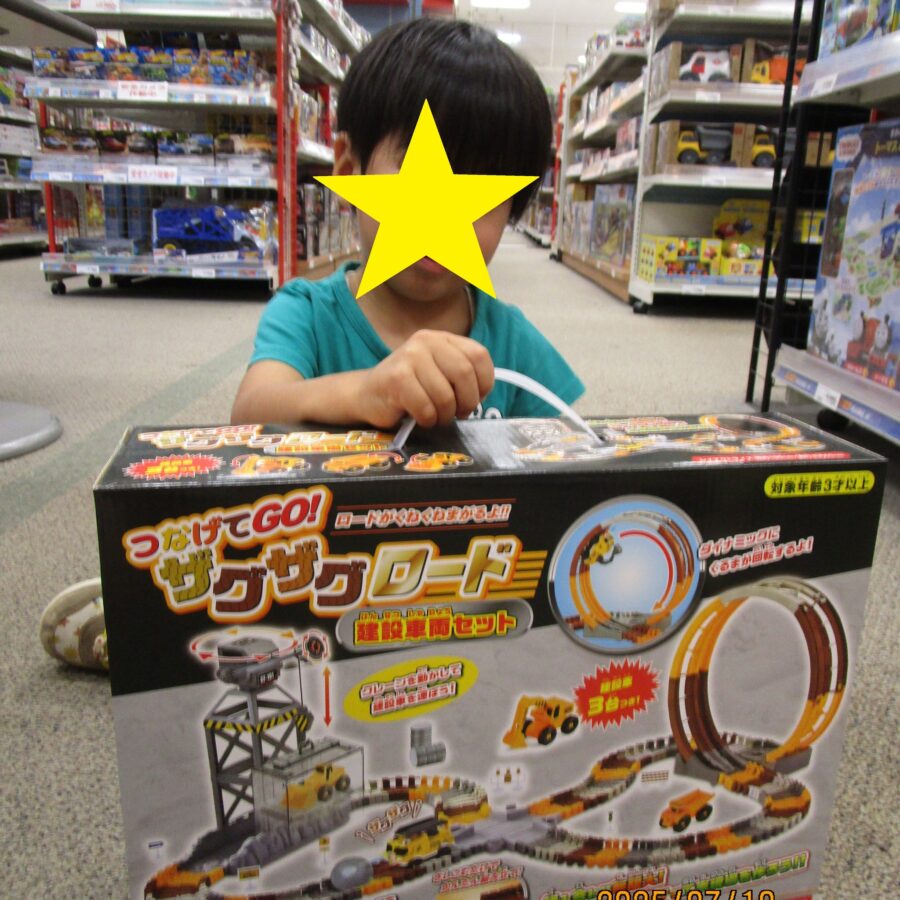 今日はぼくの誕生日!お店に行って、大好きな車のおもちゃを選んだよ。